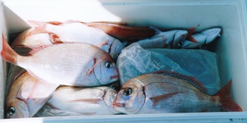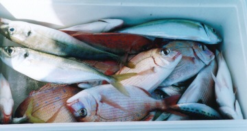 釣果=ハナダイ20から30cmぐらい80匹、アジ20から25p数匹、サバ20から40p