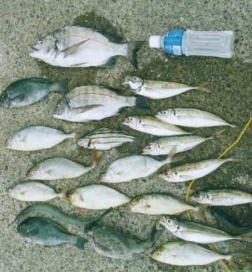 ボラがうじゃうじゃわいており遠投するとアジがいる。平屋さんはそのなか20cmくらいのチヌを