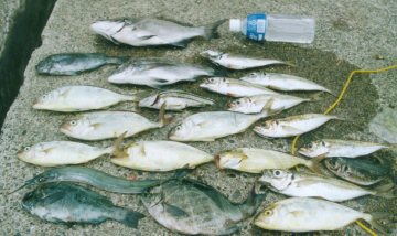 釣れるのは木っ端メジナがほとんどであるがアジ(20前後)やカンパチ(20〜30ぐらい)もぽつぽつ釣れる。