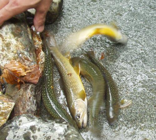 その上からはやっと20cm以上のイワナ、アマゴが釣れるようになった。サイズは22cmまで