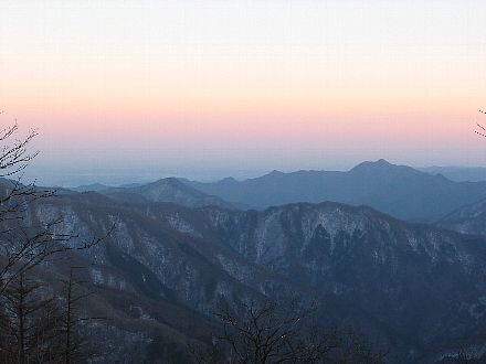 新しく買ったデジカメの試撮も兼ねて。 朝、3時に起きたのだがネットしてたり準備してたりしたら4時半の始発に乗れなかった…。 次の電車で奥多摩駅へ行ったがバスの時間まで45分ほど待ち…う 〜ん。奥多摩はうっすらと雪を被っていた。きっと昨日のうちに軽く降ったのだろう。 デジカメを持って橋を上から川を眺めたり写真を撮っているうちにバスの時間。ちょっと 揺られて川乗橋で降りる。 初めての川乗林道をてくてく歩くとすぐに鳥屋戸尾根の入り口があった。 地図では赤の点線の道だが踏み跡ははっきりしていて迷うところはない。 まあ登りなんでひたすら尾根に沿って登るだけなんだけど。 最初は暗い植林の中を登っていく。1時間もしないうちに自然林も出てきて樹間から周りの山も見える。 一カ所、赤テープにだまされて危ないトラバースをさせられる。結構な傾斜の斜面で滑ったら数十mは滑落か。 途中で危険を感じ斜面を四つん這いになり木の根っこなどに掴まりながら 直登(これも危ないんだけど…)、すぐにしっかりした踏み跡にでた。10mも引き返せば こんなことにならなかったのにと一人で苦笑する。 途中、トヤド山の標識を通って笙ノ岩山に到着した。葉が全て落ちているんでそこそこ展望もある。 雲取山が遠くに見えた。遠いな〜w。 この辺から雪が出始め、北斜面にはだいたい残るようになった。それに風が強い。気温も0℃以下だろう。 カッパを着込み歩きだす。歩くと暑くなるんだけど…。すぐに川苔山と都心の大展望を満喫してから だらだらとアップダウンを繰り返して蕎麦粒山に到着。時間を見てびっくり、結構時間がかかってしまった。 体力ないな〜、バイトで走り込みや筋トレさぼっていたのが原因かな。荷も久しぶりの20キロオーバーだったし。 蕎麦粒山からの展望はかなり良く、ここから初日の出みたら最高じゃないかと思ってしまった。 寒そうだけど。時間がもう昼なので都心は霞んでしまっていたのが残念だ。新宿のビルがかろうじて 分かるぐらい。アホな写真を撮って出発。 以前来たとき踏んでいなかった仙元峠を踏んで一杯水小屋へ。 ここは峠と行ってもピークにあるけど。秩父への道は雪の下だった。 一杯水小屋で大休憩、靴脱ぐと両踵が靴擦れを起こしていた。 前日ダイソーで買った絆創膏を貼って置くが気休めぐらい。 以後は痛いの我慢しながら歩いていた。 小屋の中は0℃、外は−3℃だった。きっと夜は寒いんだろうなと思う。 今回は長沢背稜のピーク(大栗山、七跳山、坊主山、日向沢ノ頭など)を踏むつもりでいたが 靴擦れ、体力のなさ、時間切れにより断念、酉谷山だけ踏むことにした。せめて大栗山だけでもと思い 、尾根沿いに歩いて無駄に小さなピークをいくつか踏んでみたが標識は何もない…。無駄に体力使っただけだった。 大栗山も通り過ぎたのか標識がなかったのかよく分からなかった。まあ途中のハナド岩からの展望が良かったからいいのさ。 石尾根を一望でき展望のあまりない長沢背稜では別格。小屋から30分くらいしか来てないのに またくつろいでしまった…。ここから酉谷小屋まではだらだらアップダウンしながら若干登っていく。 途中、下りでアイスバーンになっているところがあり何回かすっころんでしまった。 半分以上は土の道なんで軽アイゼンだすの渋らなきゃよかった。まあ転けても滑落するような場所じゃないけど。 酉谷小屋には16時前に到着、当然誰もいない。 中は西日があたりポカポカであった。気温5℃ぐらい。 早速小屋に置いてあるマットと毛布を使って寝床を作成する。 寝る準備と飯の準備が終わったら酉谷山頂目指してカメラと小物だけもって出発。 もう太陽は山に隠れてしまった。だんだん空も染まってきたし急がないと。 ザックを背負ってないと軽い軽い、すんなりと山頂に着いてしまった。 木の間から富士山や丹沢、大岳山が夕日に染まって美しい。 街中でもピンクに染まっていく夕焼けは見られるがやっぱり山で見たほうが心に響く。 もうちょい山頂に残りたかったが寒くなったので小屋に戻る。 展望は小屋からも素晴らしい。遮るものが何もない中、都心から富士山まで見ることができる。 小屋に戻るともう暗くなり始めていたが富士山が綺麗だった。なんか雲が線みたいになっていて 富士山を際だたせていた。夕飯はビール飲みながらウィスキーちびちび、餅をお湯で柔らかくして きな粉の中にいれて安倍川餅に。まあおいしい。時々夜景を見たりしているうちに眠くなり 7時過ぎに就寝。満月だったせいか空が明るく星はあまり見えなかった。山並みは 白く綺麗に見えてたのだけど写真には写ってなかったな。ショボーン |