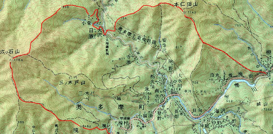 | 鳩ノ巣駅〜 | 本仁田山〜 | 日原マス釣り場〜 | 小菅山〜 | 六ツ石山〜 | 境橋 |
