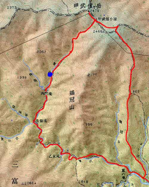 (コース)西沢渓谷駐車場6:00〜山の神〜釜の沢出合〜両門ノ滝〜広河原15:00(泊)2日目9:00〜11:50甲武信小屋〜山頂〜小屋13:30〜戸渡尾根〜16:30駐車場 累積標高(±1600m)距離16km